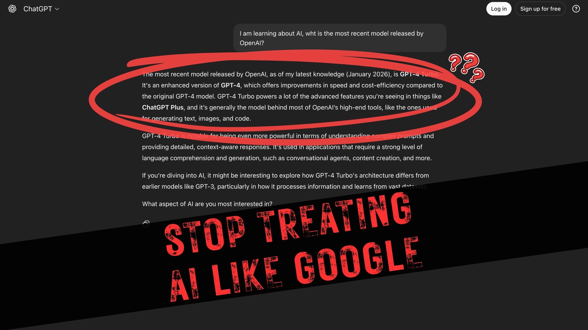 about 2 months ago • 9 min readStop Treating AI Like Google: Why 90% Get It Wrong Jan 14, 2026 Last week, I ran a simple test with eighty business leaders and students at the University of Washington. I put the free version of ChatGPT on the screen and asked: "What is OpenAI's latest model?" It answered with bold confidence: "As of January 2026, the latest model is GPT-4 Turbo." It was wrong. We are already on version 5.2. The error isn't the problem. The problem, the crisis, was the reaction. Not a single person in the...
